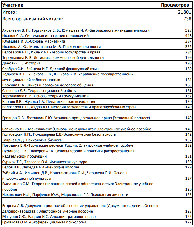 Ежегодный мониторинг носит аналитический характер, он позволяет вузу и библиотеке, наблюдать за своими результатами и достижениями коллег, видеть изменения в собственной деятельности, отслеживать, какой контент наиболее востребован у читателей, кто из участников активно читает и издаёт литературу, чтобы учитывать это в своей работе.