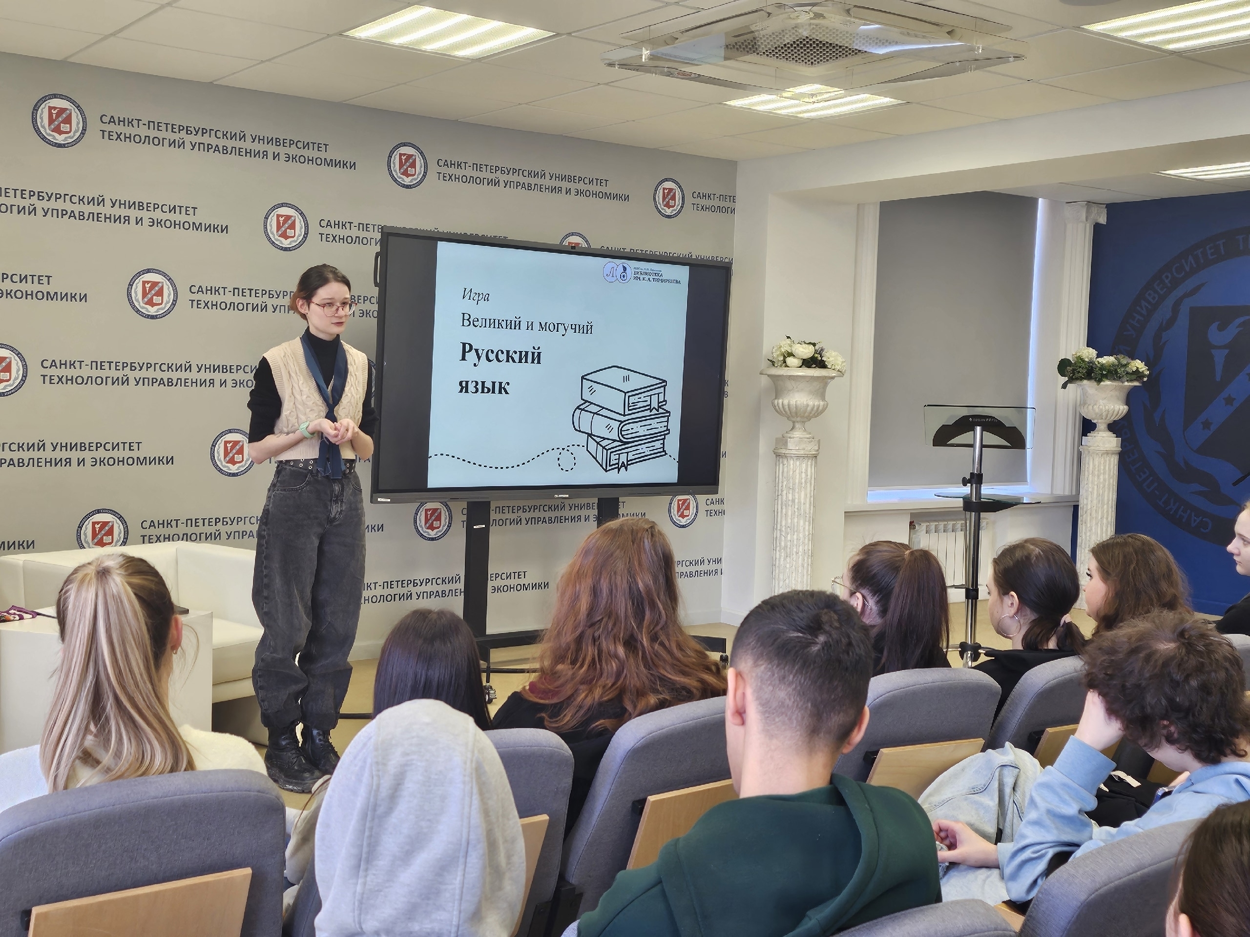 Библиотека СПбУТУиЭ провела интерактивное мероприятие «Великий и могучий русский язык» совместно с библиотекой им. К. А. Тимирязева, посвятив его нормам русского языка и культурному наследию в Год единства народов России. Участники, студенты колледжа, в формате игры «Своя игра» проверяли знания об орфографии, архаизмах и переводе с местных языков, выполняли творческие задания и обсуждали современные речевые нормы.