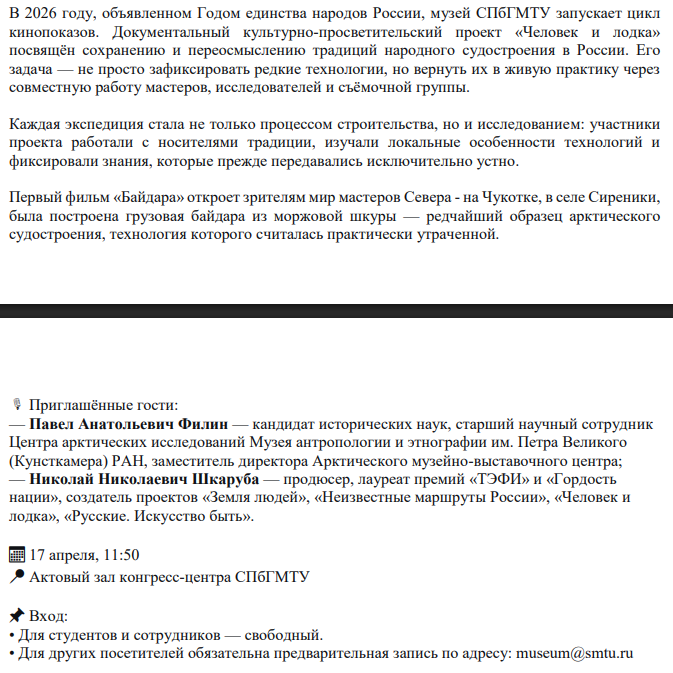 В СПбГМТУ стартует цикл кинопоказов о традиционном судостроении народов России